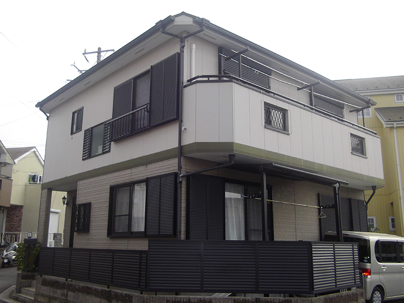 サイディング外壁の表面が紫外線劣化により、小さく欠けている箇所が多くあったため、その欠けを埋める性能と「透湿性」がある下塗り塗料をご提案させて頂きました。サイディング外壁の場合は、塗料の厚みがつきすぎているによって内部の水分や湿気が閉じ込められ、その影響ででフクレという不具合が発生することがあるため、湿気を閉じ込めにくい「透湿性」のある塗料を選択することも重要なポイントになります。